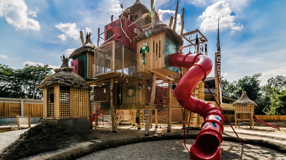 Koncepčním záměrem je přiblížit dětem atmosféru života obyvatel pralesa, stromových domů, amazonské vesnice. Nejvýraznějším prvkem a hlavní atrakcí je netradiční zpracování víceúrovňové dětské stavby, která se s motivy indiánské domorodé vesnice vymyká běžnému ztvárnění obdobných staveb. Jedná se o obrovský herní systém, sestavený z mnoha drobných domečků, které jsou vzájemně propojeny žebříky, schůdky, stupátky a provazy. Každá jednotlivá úroveň herního komplexu je nositelkou speciální atmosféry, barevnosti a doplňkových prvků. Tvůrci návrhu jsou mladí výtvarníci Jakub Nepraš a Matěj Hájek.