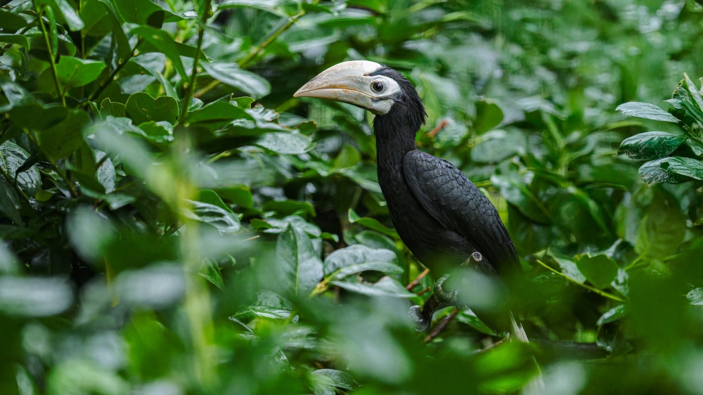 Mládě zoborožce běloocasého ve voliéře mezi Pavilonem tučňáků a Darwinovým kráterem. Tento druh je jedním z jedenácti endemických zoborožců z Filipín. V Evropě jej chová pouhých šest zoo. Foto Petr Hamerník, Zoo Praha