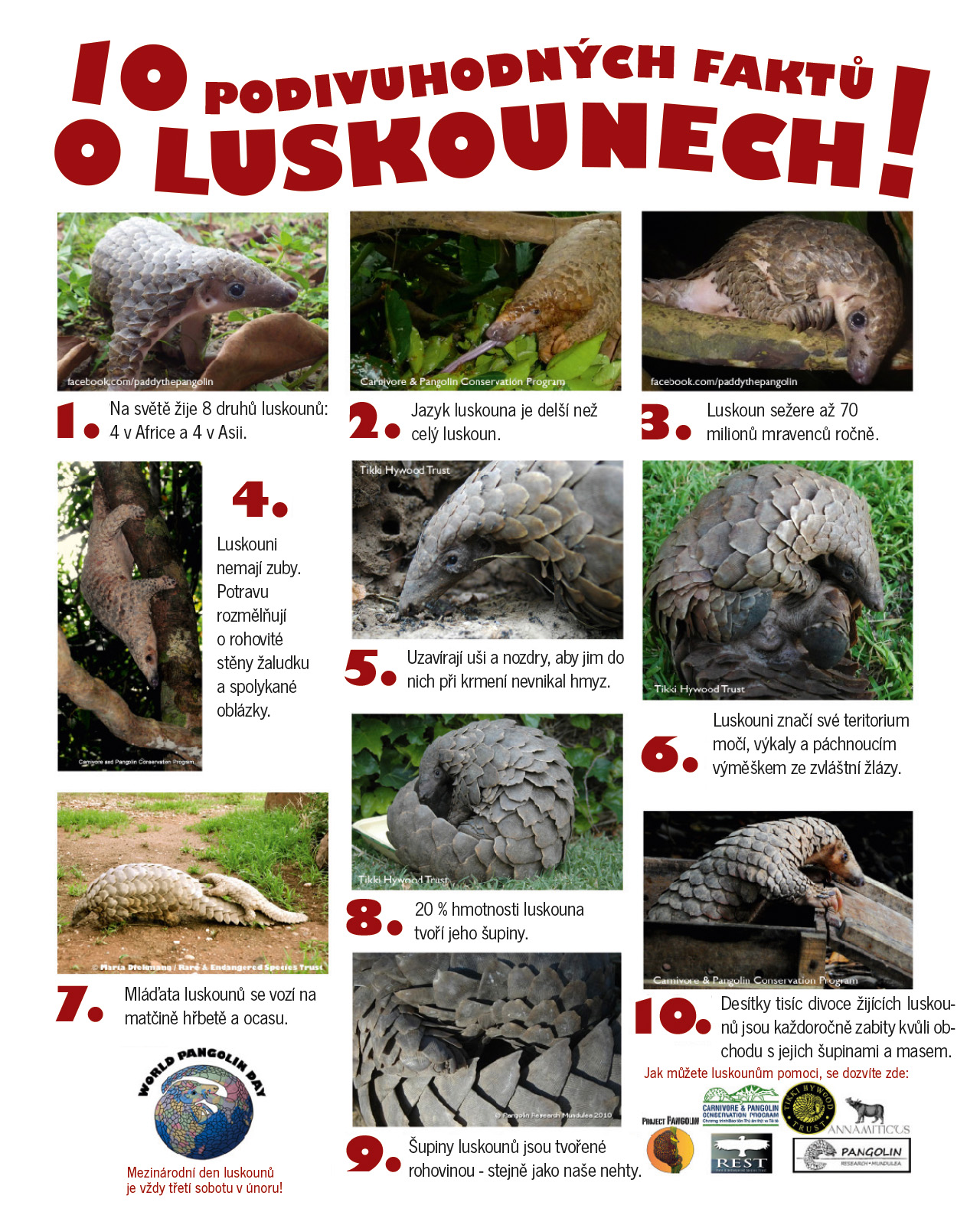 Připomenout ohrožení luskounů si klade za cíl World Pangolin Day, který probíhá vždy třetí únorovou sobotu; letos 21. února. Jakkoli se k němu připojit - třeba laikem nebo sdílením našeho facebookového příspěvku je lepší, než neudělat vůbec nic.