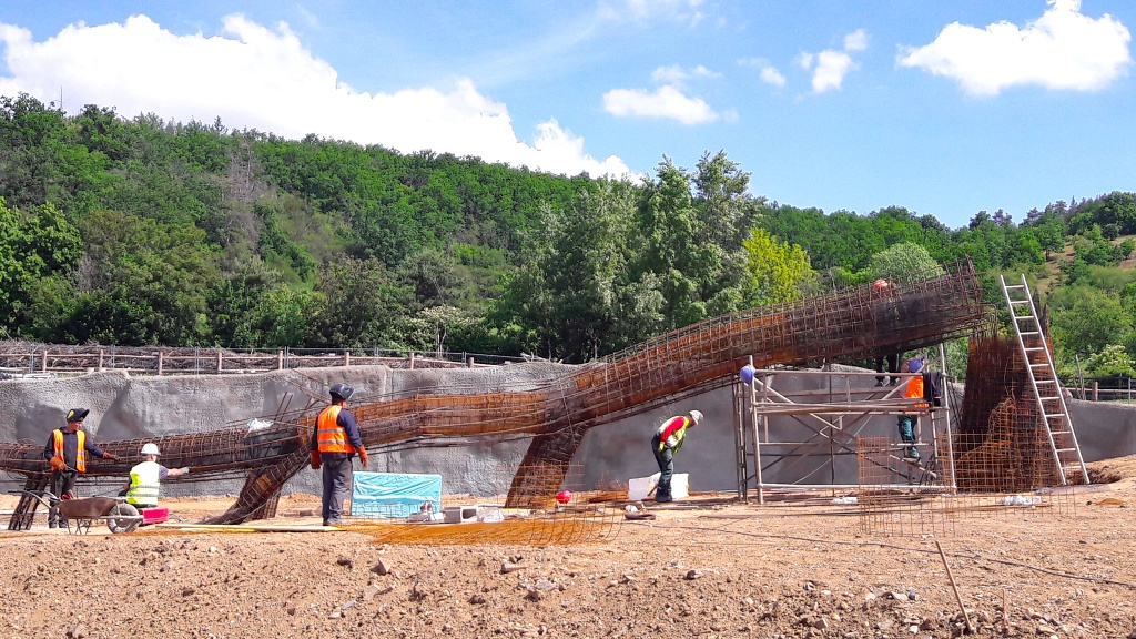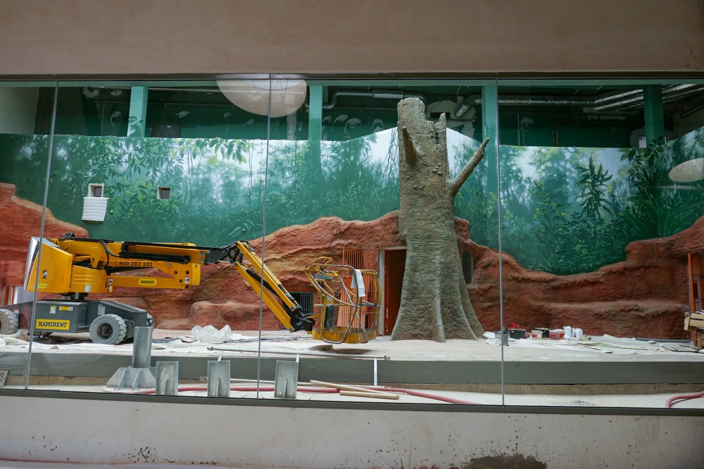 Jednou z nejnáročnějších realizací v pavilonu je obrovský kmen ve venkovním výběhu chovné skupiny – tuny železa svařené do konstrukce základního tvaru a tuny betonu modelované do finálního tvaru padlého pralesního velikána. Ten byl posléze obklopen parkosy i živou zelení a dodává výběhu měřítko, které takto prostorově velkorysá expozice nutně potřebovala.
