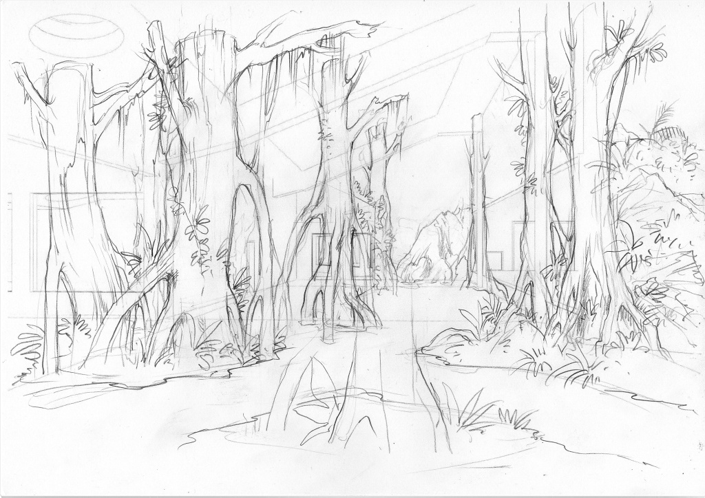 Pro výtvarníky vše začalo v únoru 2017, při inspirační cestě do Kamerunu, které se zúčastnil Roman Hudziec. Po návratu s kolegou Kryštofem Krejčou začal pracovat na návrzích výtvarného řešení pavilonu v úzké spolupráci s architekty, s vedením zoo a se zoology a chovateli. Po mnoha diskusích byla stanovena základní koncepce pavilonu: cesta návštěvníka od africké vesnice se školní třídou přes sekundární a primárnímu les na „mýtinu“ s gorilami.