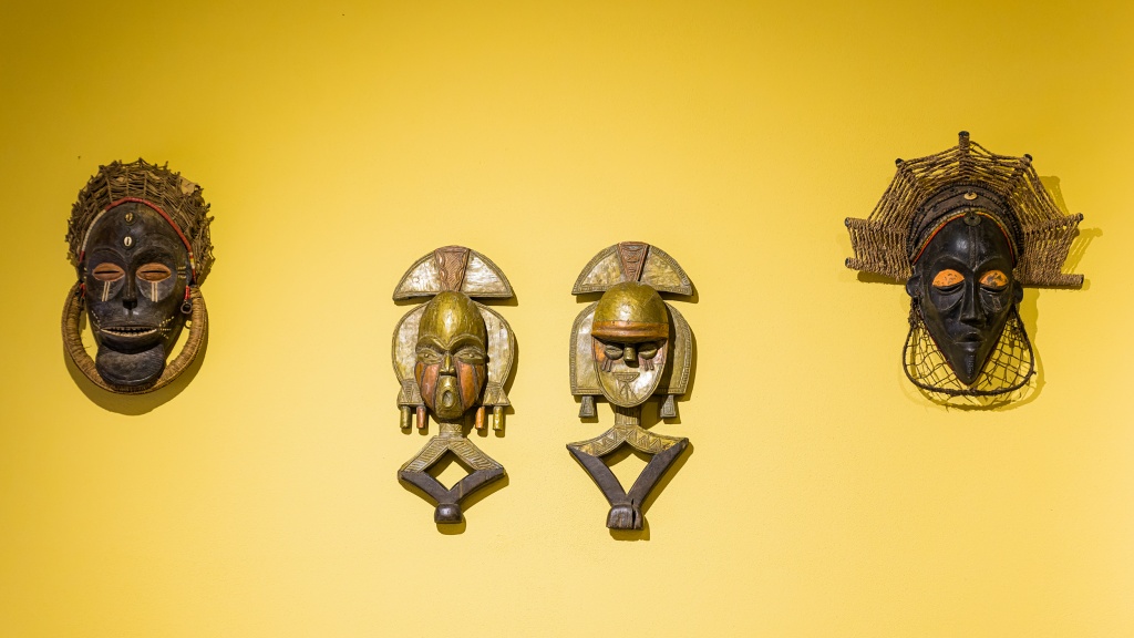 Masky na stěně obchodu se suvenýry v pavilonu Rezervace Dja. Foto: Petr Hamerník, Zoo Praha