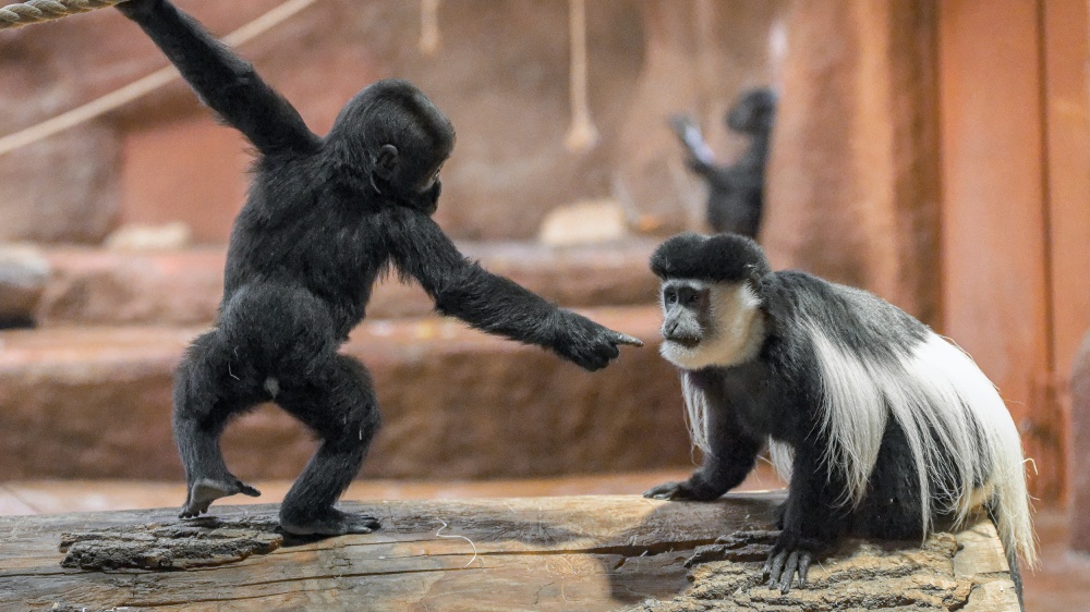 Prostor s chovnou skupinou goril nížinných sdílejí guerézy pláštíkové – společenské a celkem klidné stromové opice ze střední a východní Afriky.