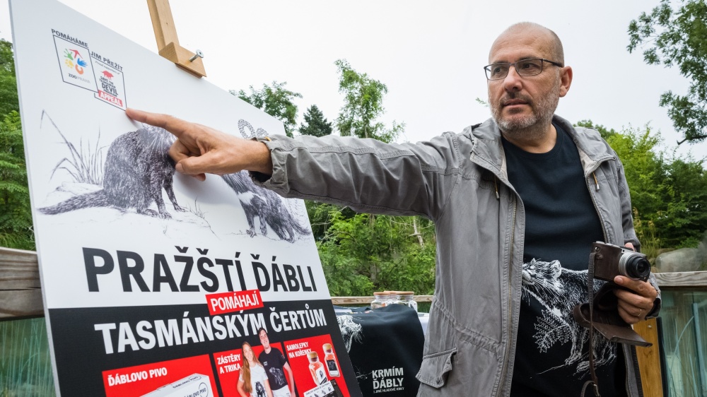 The Prague Imps Help Tasmanian Devils project will support the development of a vaccine against Devil Facial Tumour, which threatens Tasmanian devils in the wild. The photo shows Prague Zoo’s director, Miroslav Bobek, with the logo of the Save the Tasmanian Devil Appeal, which will be supported with part of the proceeds from the sale of devil merchandise.: Petr Hamerník, Prague Zoo.