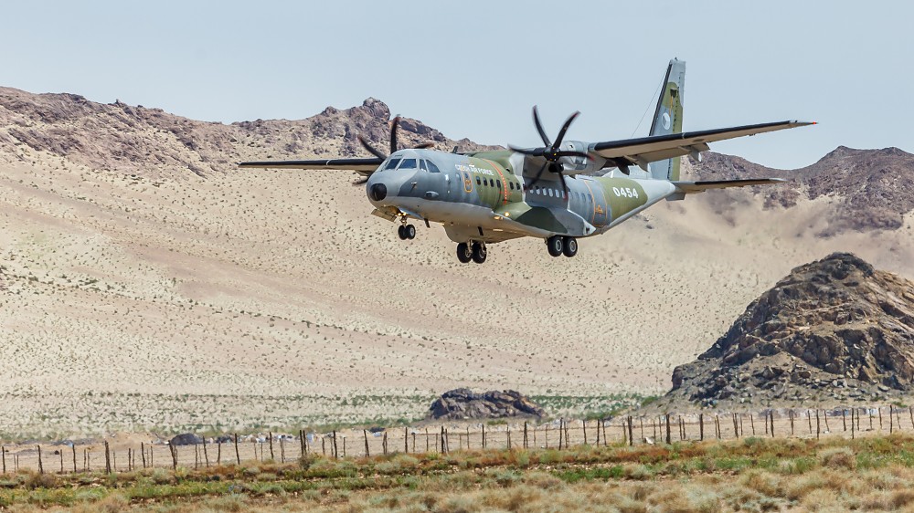 Přistání armádního letounu CASA na nezpevněné letištní ploše v Bulgan Sumu. Foto: Kryštof Bobek, Zoo Praha