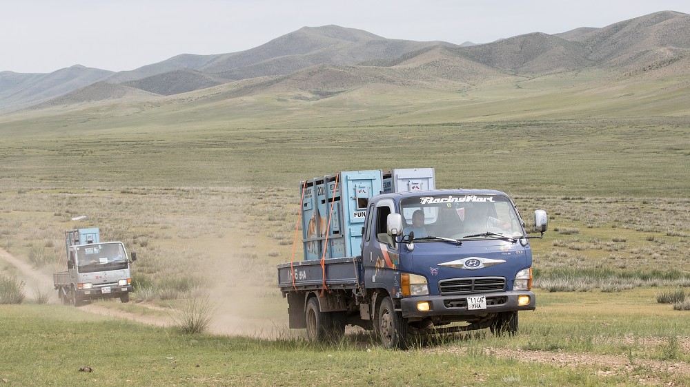 V rámci letošního zdvojeného transportu koní Převalského probíhá dnes v Mongolsku přeprava čtyř „převaláků“ z národního parku Khustain Nuruu poblíž Ulánbátaru do Přísně chráněné oblasti Gobi B na západě Mongolska.