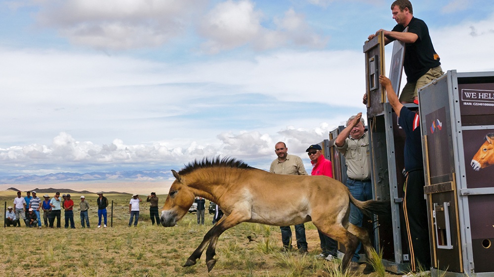 Historický okamžik a završení náročného, bezprecedentního projektu pražské zoologické zahrady: 16. června 2011 vybíhá jeden ze čtyř koní Převalského z přepravní bedny do aklimatizační ohrady v oblasti Chomyn tal poblíž národního parku Char Us núr v západním Mongolsku. Foto: Jana Ptačinská Jirátová, Zoo Praha Historický okamžik a završení náročného, bezprecedentního projektu pražské zoologické zahrady: 16. června 2011 vybíhá jeden ze čtyř koní Převalského z přepravní bedny do aklimatizační ohrady v oblasti Chomyn tal poblíž národního parku Char Us núr v západním Mongolsku. Foto: Jana Ptačinská Jirátová, Zoo Praha