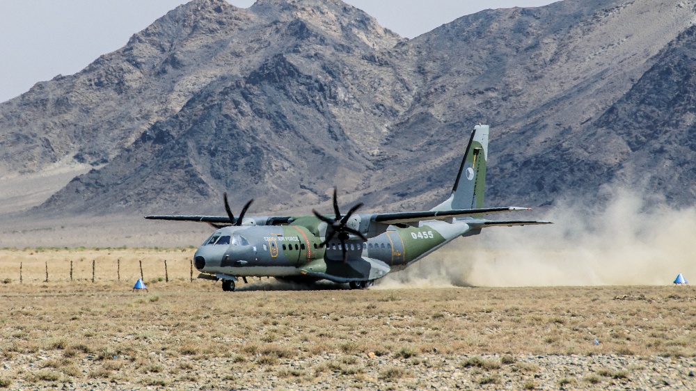 Letoun CASA převážející koně Převalského přistává na nezpevněné dráze v Bulgan sumu na západě Mongolska. Foto: Jaroslav Šimek, Zoo Praha
