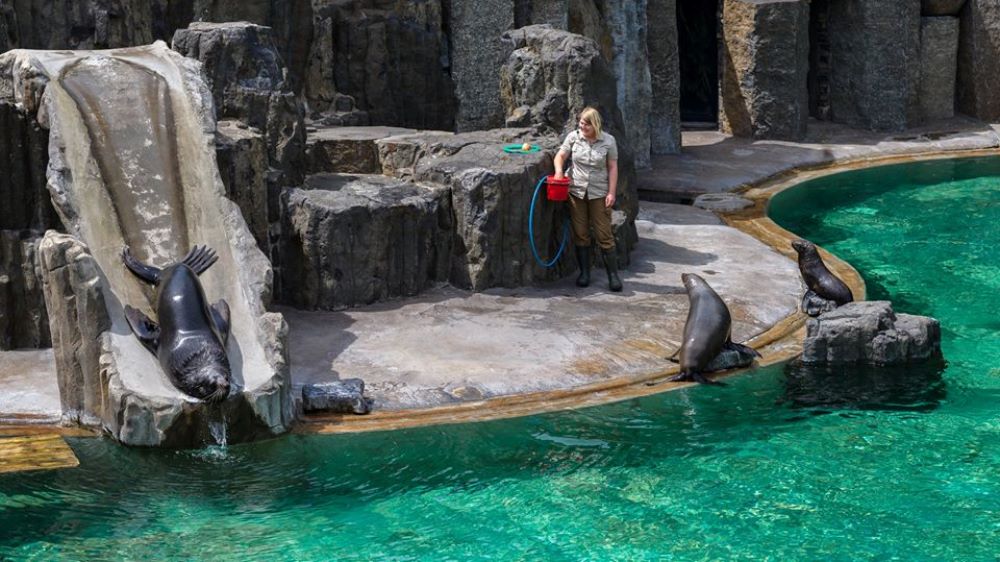 Lachtani zde mají prostorný bazén, do kterého vede ze skály skluzavka a nad nímž se klene kamenná lávka. Ta těmto vodním šelmám zvětšuje prostor souše a chovatelům během cvičení umožňuje přístup nad vodu.